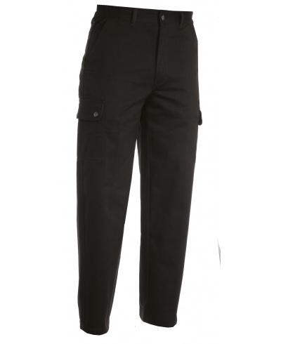 Winter-Herrenhose mit seitlich dehnbarem Bund und Gürtelschlaufen, Hosenschlitz mit Metallreißverschluss und -knopf, zwei klassisch geschnittenen Vordertaschen, zwei Seitentaschen mit Patte und Druckknöpfen, einer Reißverschlusstasche links, einer Einstecktasche für den Zollstock rechts, zwei Gesäß-Leistentaschen mit Knopf und Knopfloch