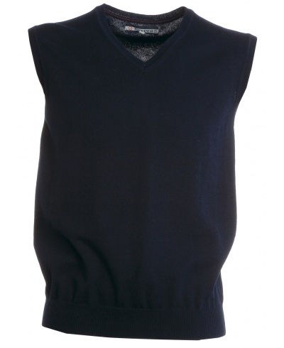 Herren-Pullunder mit V-Ausschnitt, Halsabschluss, Ärmelbündchen und Taille aus Feinripp, glatt und nahtlos gestrickt