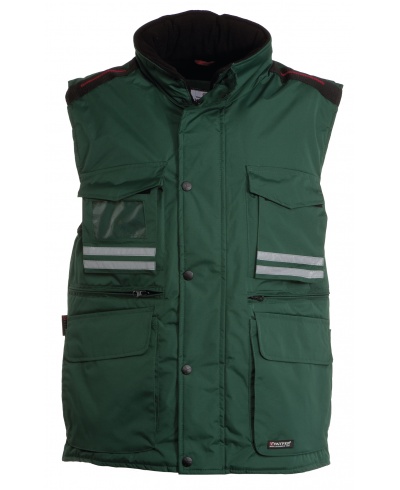 Herren-Weste mit verdecktem 8 mm Reißverschluss aus Kunststoff mit Metallschieber und Kunststoffknöpfen, vorgeformter, abnehmbarer oder im Kragen einrollbarer Kapuze, grauen Reflexstreifen vorne und hinten, Seitenschlitz mit Ziehharmonikafalte und Reißverschluss, neun Außentaschen, davon zwei mit