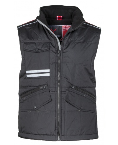 Taillierte Herren-Weste mit Reißverschluss, zwei Außentaschen mit LOCK SYSTEM und zwei mit Reißverschluss, schräg stehenden Taschen, um das Einführen der Hand zu erleichtern, einer Handy-Brusttasche und einem Ring zum Befestigen des Ausweises, Reflexstreifen auf der Tasche und auf dem Rücken; Innenseite: wattiert, Fleece in Kontrastfarbe auf Rücken und Kragen, Innenreißverschluss zum einfacheren Veredeln mit Druck und Stick