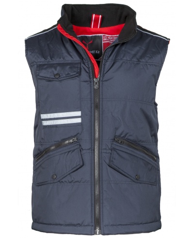 Taillierte Herren-Weste mit Reißverschluss, zwei Außentaschen mit LOCK SYSTEM und zwei mit Reißverschluss, schräg stehenden Taschen, um das Einführen der Hand zu erleichtern, einer Handy-Brusttasche und einem Ring zum Befestigen des Ausweises, Reflexstreifen auf der Tasche und auf dem Rücken; Innenseite: wattiert, Fleece in Kontrastfarbe auf Rücken und Kragen, Innenreißverschluss zum einfacheren Veredeln mit Druck und Stick