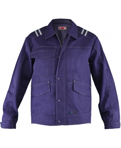 Jacke im Jeans-Design aus Baumwolle, antistatisch, säurebeständig, feuerhemmend, beständig gegen Lichtbogen und für Schweißer geeignet, Doppelnähte in Kontrastfarbe mit Verstärkung an den Ärmeln, an der Seite und hinten. 2 große Taschen in der Taille und 1 kleine Brusttasche rechts mit Stifthalter, alle mit Patte und Klettverschluss. Zur besseren Abdeckung hinten abgerundet und Weitenregulierung mit Klettverschluss, Kugelärmel mit elastischem Bündchen und Knebelverschluss mit Klettband zur Weitenregulierung. Verdeckter Reißverschluss mit Druckknöpfen. 3M-Reflexstreifen auf den Schultern und am unteren Rand hinten, abnehmbares Ausweisfach aus Kunststoff
