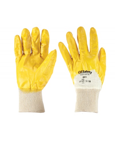 NBR-Gummihandschuhe, belüfteter Rücken, gestrickte Bündchen, Interlock 24 G Baumwolle; Eigenschaften: robust, sehr widerstandsfähig; Stärken: Passform, Griffigkeit, Schutz, beständig gegen Flüssigkeiten, praktisch; Einsatzbereiche: schwere Handhabung, Metalle, scharf und abrasiv Materialien, Öl, Fett, Schmutz, Kohlenwasserstoffe, Schmiermittel