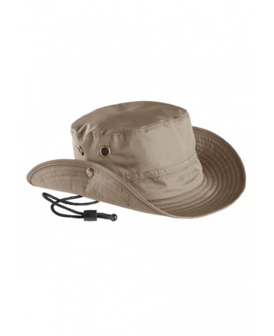 100% beschichtetes Polyester. Hauptnähte verklebt, um eine verbesserte Wasserresistenz zu ermöglichen. Breite, weiche und faltbare Krempe mit seitlichen Druckknöpfen, Lüftungsösen, Riemen mit Stopper. In zwei Größen erhältlich.