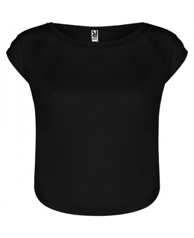 T-Shirt, überschnitten, weiter Halsausschnitt. Runde Ziernaht in Schulterhöhe. Abgerundeter Saum.