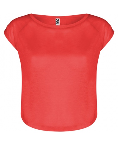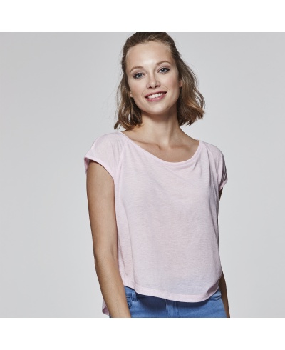 T-Shirt, überschnitten, weiter Halsausschnitt. Runde Ziernaht in Schulterhöhe. Abgerundeter Saum.