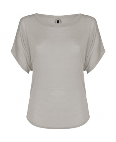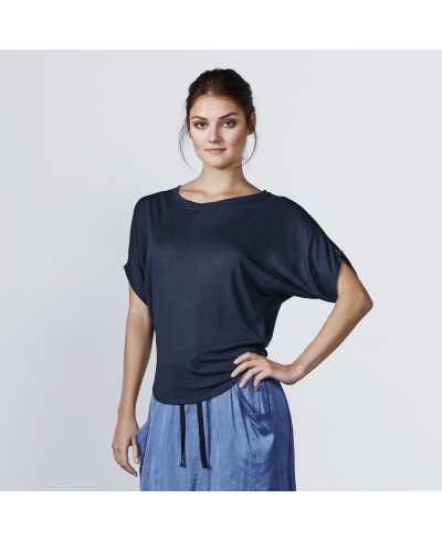 T-Shirt, überschnitten, weiter Halsausschnitt. Nahtlose Ärmel im Fledermausstil, abgerundeter Saum.