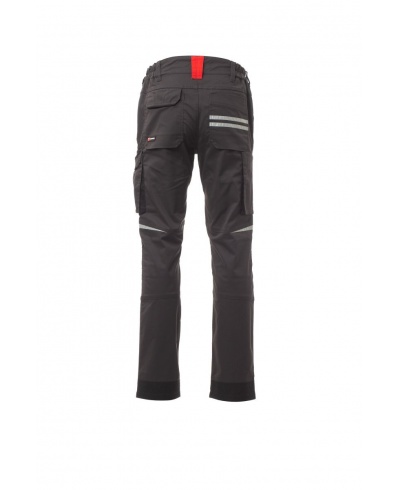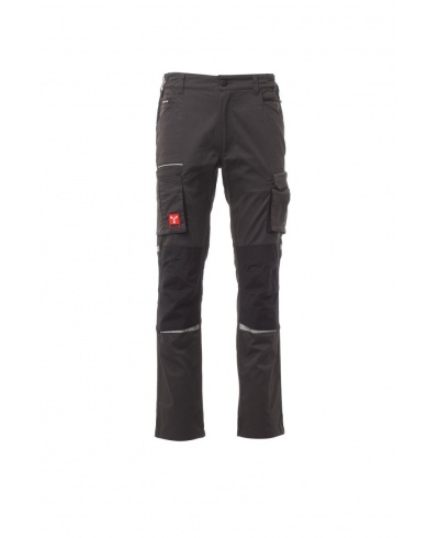 Unisex-Hose, Stretch, Ganzjahreshose, Gummibänder an den Seiten und Gürtelschlaufen an der Taille, Reißverschluss und ein personalisierter Knopf. Die Hose hat zwei geformte Taschen auf der Vorderseite, eine Münztasche auf der rechten Seite und eine Sicherheitstasche mit Reißverschluss auf der linken Seite. Auf der Vorderseite des linken Beins befinden sich eine Zwickeltasche, eine Velcro-Klappe und ein Namensschildbeutel. Auf der Vorderseite des rechten Beins befindet sich eine Handytasche mit reflektierendem Saum und eine Tasche mit Zwickel. Beide Beine haben Befestigungen für Nylon O Knieschoner