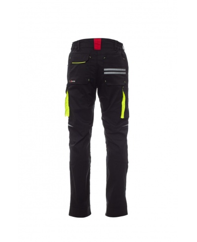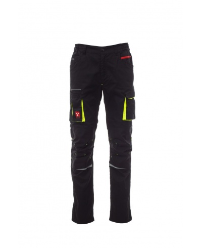 Unisex-Hose, Stretch, Ganzjahreshose, Gummibänder an den Seiten und Gürtelschlaufen an der Taille, Reißverschluss und ein personalisierter Knopf. Die Hose hat zwei geformte Taschen auf der Vorderseite, eine Münztasche auf der rechten Seite und eine Sicherheitstasche mit Reißverschluss auf der linken Seite. Auf der Vorderseite des linken Beins befinden sich eine Zwickeltasche, eine Velcro-Klappe und ein Namensschildbeutel. Auf der Vorderseite des rechten Beins befindet sich eine Handytasche mit reflektierendem Saum und eine Tasche mit Zwickel. Beide Beine haben Befestigungen für Nylon O Knieschoner