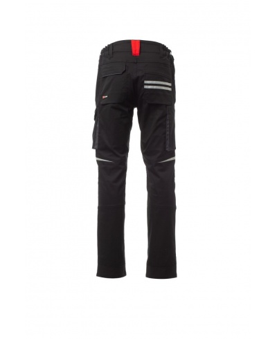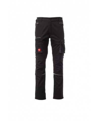 Unisex-Hose, Stretch, Ganzjahreshose, Gummibänder an den Seiten und Gürtelschlaufen an der Taille, Reißverschluss und ein personalisierter Knopf. Die Hose hat zwei geformte Taschen auf der Vorderseite, eine Münztasche auf der rechten Seite und eine Sicherheitstasche mit Reißverschluss auf der linken Seite. Auf der Vorderseite des linken Beins befinden sich eine Zwickeltasche, eine Velcro-Klappe und ein Namensschildbeutel. Auf der Vorderseite des rechten Beins befindet sich eine Handytasche mit reflektierendem Saum und eine Tasche mit Zwickel. Beide Beine haben Befestigungen für Nylon O Knieschoner