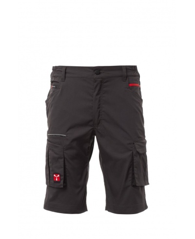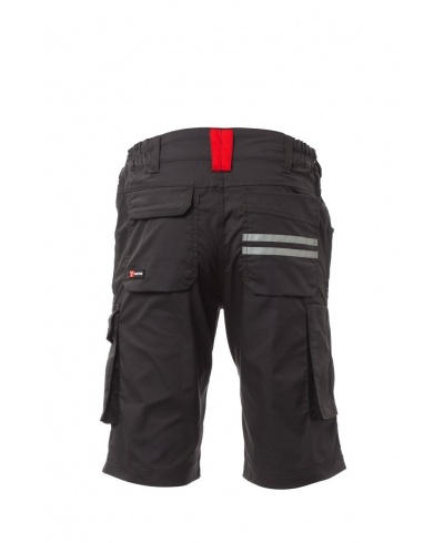 Unisex-Bermudashorts, dehnbare, elastische Bänder an den Seiten und Gürtelschlaufen an der Taille, Reißverschluss und ein personalisierter Knopf. Die Hose hat zwei geformte Taschen auf der Vorderseite, eine Münztasche auf der rechten Seite und eine Sicherheitstasche mit Reißverschluss auf der linken Seite. Auf der Vorderseite des linken Beins befinden sich eine Zwickeltasche, eine Velcro-Klappe und ein Namensschildbeutel. Auf der Vorderseite des rechten Beins befinden sich: eine Smartphone-Tasche mit reflektierendem Besatz und eine Tasche mit Zwickel. Auf der Rückseite befindet sich: eine Tasche mit einer kleinen Patte.