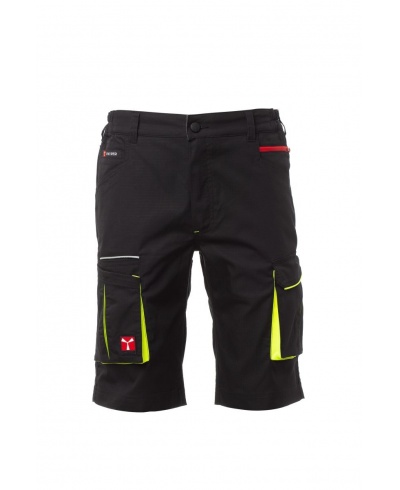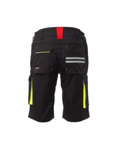 Unisex-Bermudashorts, dehnbare, elastische Bänder an den Seiten und Gürtelschlaufen an der Taille, Reißverschluss und ein personalisierter Knopf. Die Hose hat zwei geformte Taschen auf der Vorderseite, eine Münztasche auf der rechten Seite und eine Sicherheitstasche mit Reißverschluss auf der linken Seite. Auf der Vorderseite des linken Beins befinden sich eine Zwickeltasche, eine Velcro-Klappe und ein Namensschildbeutel. Auf der Vorderseite des rechten Beins befinden sich: eine Smartphone-Tasche mit reflektierendem Besatz und eine Tasche mit Zwickel. Auf der Rückseite befindet sich: eine Tasche mit einer kleinen Patte.