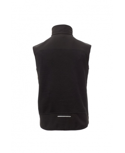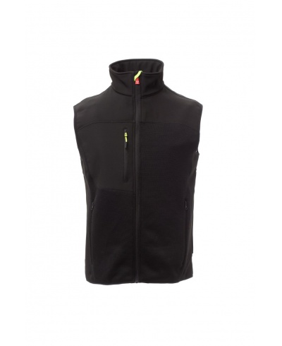 Taillierte Herrenweste, Reißverschluss mit „Semi-Auto-Lock“-Metallschieber und personalisiertem Schiebergriff. Feiner Saum an Handgelenk und Taille, 2 Seitentaschen mit Reißverschluss, 1 Brusttasche. Strickgewebe mit schwarzen Softshell-Einsätzen.
