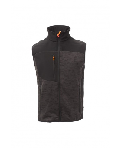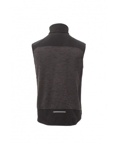 Taillierte Herrenweste, Reißverschluss mit „Semi-Auto-Lock“-Metallschieber und personalisiertem Schiebergriff. Feiner Saum an Handgelenk und Taille, 2 Seitentaschen mit Reißverschluss, 1 Brusttasche. Strickgewebe mit schwarzen Softshell-Einsätzen.