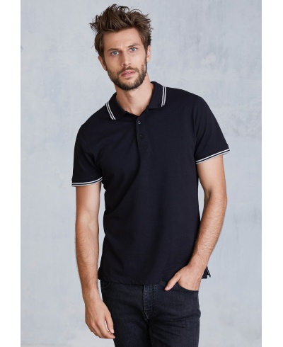100% Baumwollpiqué. Rippstrickkragen und Ärmelabschluß mit Kontraststreifen. 3-Knopfleiste. Kontrast-Nackenband. Doppelnahtsaum und Seitenschlitze.