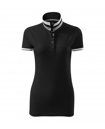 modisches Damenpolohemd mit kurzen Ärmeln, das durch Kontrastelemente verziert ist
