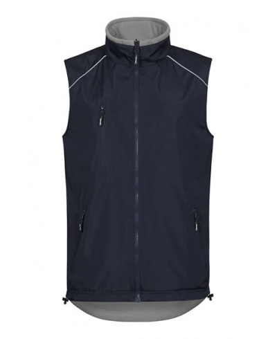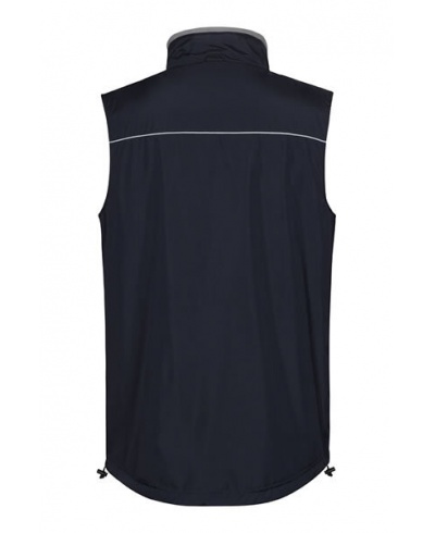 Die doppelseitige Weste mit Napoleontasche auf der Vorderseite verfügt über zwei Seitentaschen mit Reißverschluss. Die Weste verfügt über einen eingenähten Schlüsselring in der Seitentasche, reflektierende Paspeln und Reißverschlussschieber. Die Weste ist mit einem Tunnelzug am Saum mit Stiel, einem geschwungenen Saum und einem unsichtbaren Reißverschluss zur Dekoration ausgestattet. Es hat einen modernen Schnitt.