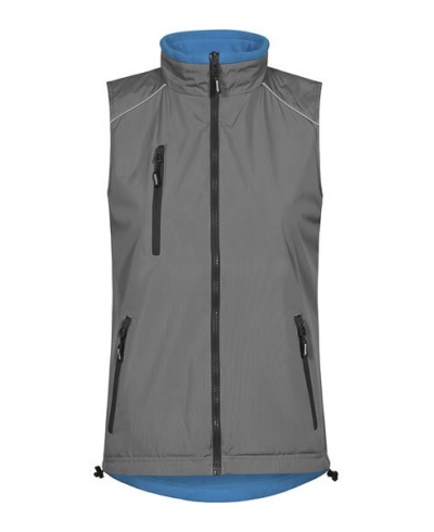 Die Wendeweste verfügt über einen Stehkragen, eine Napoleontasche vorne, zwei Seitentaschen mit Reißverschluss vorne/innen, einen eingenähten Schlüsselring in der Seitentasche, reflektierende Paspeln und Reißverschlussschieber. Die Weste hat einen Tunnelzug am Saum mit Stiel, einen abgerundeten Saum, einen unsichtbaren Reißverschluss zur Dekoration und einen modernen Schnitt.