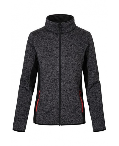 Die kontrastierende Strickfleece-Stehjacke ist innen gekämmt, hat Seiten- und Ärmeleinsätze sowie einen schmalen Saum unten am Körper und an den Ärmeln mit elastischem Einfassband, ebenfalls in Kontrastfarben. Die Jacke besteht aus Polyester und ist schmaler geschnitten.