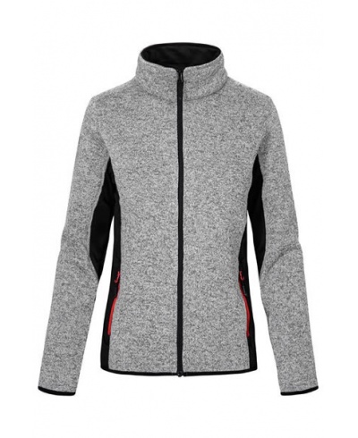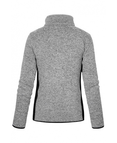 Die kontrastierende Strickfleece-Stehjacke ist innen gekämmt, hat Seiten- und Ärmeleinsätze sowie einen schmalen Saum unten am Körper und an den Ärmeln mit elastischem Einfassband, ebenfalls in Kontrastfarben. Die Jacke besteht aus Polyester und ist schmaler geschnitten.