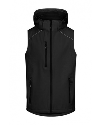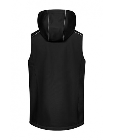 Funktionsweste mit abnehmbarer Kapuze mit Lautstärkeregler, wasserabweisenden Reißverschlüssen, Kinnschutz, Napoleontasche, Tunnelzug am Saum mit innenliegenden Kordelzugstoppern, längerem Rücken mit abgerundetem Saum, zwei seitlichen Reißverschlusstaschen, eingenähtem Schlüsselring in der Seitentasche, reflektierenden Paspeln und Reißverschluss Abzieher, getäfelte Nähte, neutrales Größenetikett. Das Material der Weste ist atmungsaktiv, wasserdicht (8.000 mm). Die Weste hat einen modernen Schnitt.