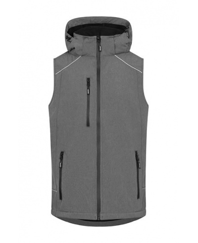 Funktionsweste mit abnehmbarer Kapuze mit Lautstärkeregler, wasserabweisenden Reißverschlüssen, Kinnschutz, Napoleontasche, Tunnelzug am Saum mit innenliegenden Kordelzugstoppern, längerem Rücken mit abgerundetem Saum, zwei seitlichen Reißverschlusstaschen, eingenähtem Schlüsselring in der Seitentasche, reflektierenden Paspeln und Reißverschluss Abzieher, getäfelte Nähte, neutrales Größenetikett. Das Material der Weste ist atmungsaktiv, wasserdicht (8.000 mm). Die Weste hat einen modernen Schnitt.