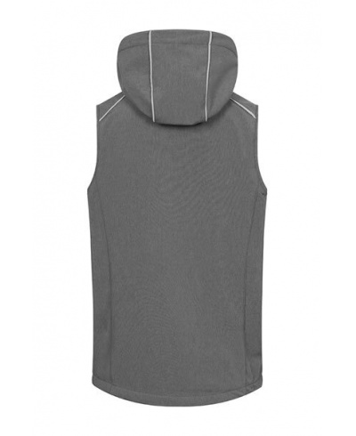 Funktionsweste mit abnehmbarer Kapuze mit Lautstärkeregler, wasserabweisenden Reißverschlüssen, Kinnschutz, Napoleontasche, Tunnelzug am Saum mit innenliegenden Kordelzugstoppern, längerem Rücken mit abgerundetem Saum, zwei seitlichen Reißverschlusstaschen, eingenähtem Schlüsselring in der Seitentasche, reflektierenden Paspeln und Reißverschluss Abzieher, getäfelte Nähte, neutrales Größenetikett. Das Material der Weste ist atmungsaktiv, wasserdicht (8.000 mm). Die Weste hat einen modernen Schnitt.