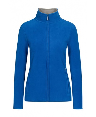 Die zweireihige Fleecejacke verfügt über einen durchgehenden verdeckten Reißverschluss, schmale Ärmelbündchen mit elastischem Saum und zwei seitliche Reißverschlusstaschen. Die Innenseite der Jacke ist in einer Kontrastfarbe gehalten und besteht aus Polyester mit beidseitiger Antipilling-Behandlung. Die Fleecejacke ist schmal geschnitten.