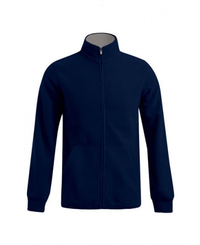Die Doppelfleecejacke verfügt über einen Stehkragen und einen durchgehenden verdeckten Reißverschluss, sowie schmale Ärmelbündchen mit elastischem Besatz und zwei seitliche Reißverschlusstaschen. Die Innenseite der Jacke ist in einer Kontrastfarbe gehalten und besteht aus Polyester mit beidseitiger Antipilling-Behandlung. Die Fleecejacke ist schmal geschnitten.