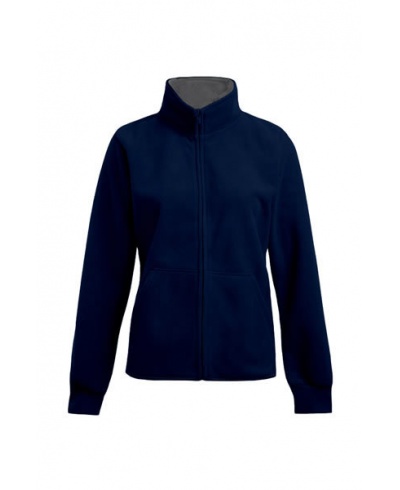 Die Doppelfleecejacke mit Stehkragen und durchgehendem Reißverschluss ist abgestimmt auf Elasthan-Ärmelbündchen und fühlbare Taschen mit Ziernähten. Die Innenseite der Jacke ist in einer Kontrastfarbe gehalten und sie besteht aus Polyester mit