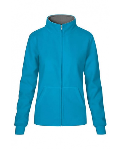 Die Doppelfleecejacke mit Stehkragen und durchgehendem Reißverschluss ist abgestimmt auf Elasthan-Ärmelbündchen und fühlbare Taschen mit Ziernähten. Die Innenseite der Jacke ist in einer Kontrastfarbe gehalten und sie besteht aus Polyester mit