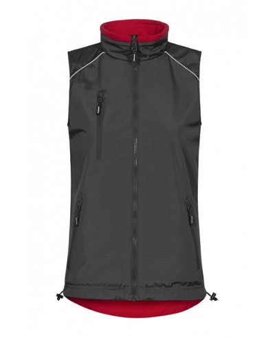 Die Wendeweste verfügt über einen Stehkragen, eine Napoleontasche vorne, zwei Seitentaschen mit Reißverschluss vorne/innen, einen eingenähten Schlüsselring in der Seitentasche, reflektierende Paspeln und Reißverschlussschieber. Die Weste hat einen Tunnelzug am Saum mit Stiel, einen abgerundeten Saum, einen unsichtbaren Reißverschluss zur Dekoration und einen modernen Schnitt.