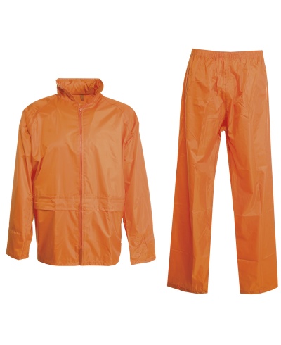 Regenanzug bestehend aus: Jacke mit Reißverschluss, im Kragen einrollbarer Kapuze, geradem Ärmelabschluss, Netzfutter im Rücken; Hose mit elastischer Taille und zwei Taschen, Einzelbeutel mit Reißverschluss