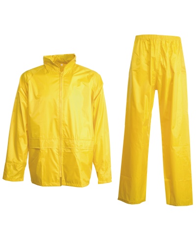 Regenanzug bestehend aus: Jacke mit Reißverschluss, im Kragen einrollbarer Kapuze, geradem Ärmelabschluss, Netzfutter im Rücken; Hose mit elastischer Taille und zwei Taschen, Einzelbeutel mit Reißverschluss