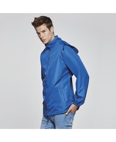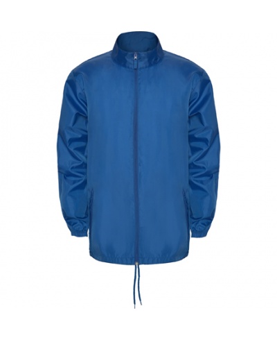Regenjacke mit hohem Kragen und durchgehendem Reißverschluss.