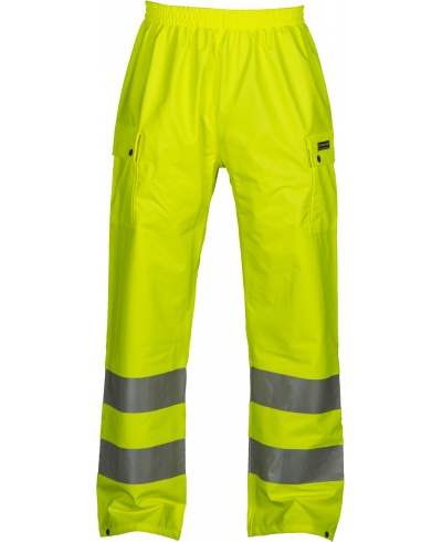 Gut sichtbare Regenhose mit 3M-Streifen, elastischer Taille, zwei seitlichen Blasebalgtaschen mit Knöpfen, Beinabschluss mit Druckknopf zur Weitenregulierung, warmversiegelten Nähten