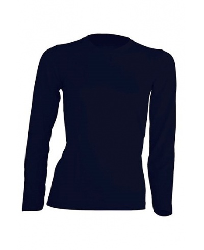 Damen T-Shirt, langer Arm ohne Bündchen Doppelnähte an Bund und Ärmeln. Nackentape von Schulter zu Schulter. Gerippter Kragen 1x1.