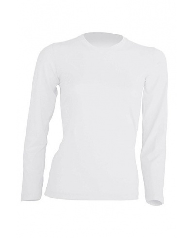 Damen T-Shirt, langer Arm ohne Bündchen Doppelnähte an Bund und Ärmeln. Nackentape von Schulter zu Schulter. Gerippter Kragen 1x1.