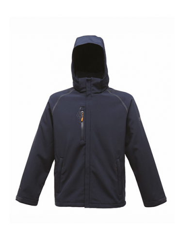 Warmrückendes Softshell-Gewebe, dauerhaft wasserabweisende Ausrüstung, Mesh-gefütterter Körper, 2 Reißverschlusstaschen unten und wasserdichte Brusttasche, abnehmbare Kapuze mit Versteller, verstellbare Ärmelbündchen, verstellbarer Shockcord-Saum, verdeckter Reißverschluss im Futter für Stickzugang