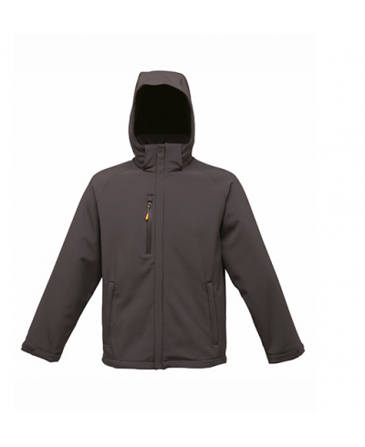 Warmrückendes Softshell-Gewebe, dauerhaft wasserabweisende Ausrüstung, Mesh-gefütterter Körper, 2 Reißverschlusstaschen unten und wasserdichte Brusttasche, abnehmbare Kapuze mit Versteller, verstellbare Ärmelbündchen, verstellbarer Shockcord-Saum, verdeckter Reißverschluss im Futter für Stickzugang