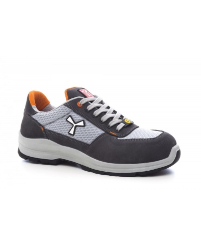 Niedriger Herren-Sicherheitsschuh, Obermaterial aus wasserabweisendem Spaltleder mit atmungsaktiven Einsätzen aus technischem Stoff, atmungsaktives und abriebfestes Innenfutter (auf der gesamten Innenfläche), 6+6 metallfreie Ösen, reflektierender Einsatz an der Hinterkappe, Zehenschutzkappe aus druckgegossenem Aluminium, herausnehmbare Einlage Ortholite X40 016 ESD, zertifizierte durchtrittsichere Sohle aus Verbundgewebe, Versteifungselement zum Schutz vor Verdrehungen, hufeisenförmiger Spitzenschutz, Zwischensohle aus federleichtem Polyurethan ESD, Dämpfungssystem MASTER BALANCE aus PU-Polyether von hoher Bruchfestigkeit und ausgewogener Dichte, X-TRAIL-GRIP-Sohle aus TPU ESD mit Fersen- und Zehenschutz