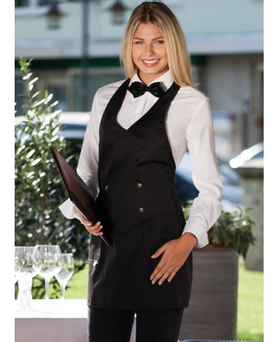 Highly fashionable, elegant apron with a waistcoat top. Clever cut and figure-hugging silhouette. Waistcoat with six decorative buttons and deep V neck. The neck and waist ties are individually adjustable by velcro fastening. Side patch pocket (15 x 13 cm).