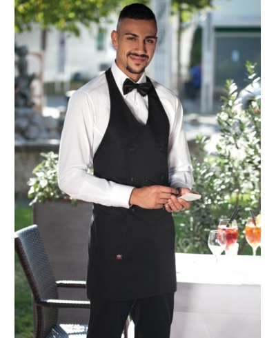 Highly fashionable, elegant apron with a waistcoat top. Clever cut and figure-hugging silhouette. Waistcoat with six decorative buttons and deep V neck. The neck and waist ties are individually adjustable by velcro fastening. Side patch pocket (15 x 13 cm).