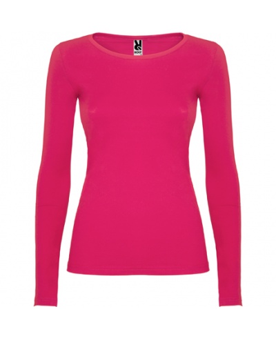 Damen Langarm T-Shirt, tailliert. Weiter, eingefasster Rundhalskragen. Offener Ärmelabschluss. Seitennähte.