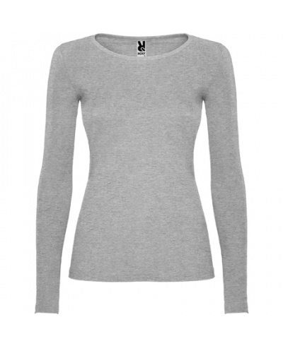 Damen Langarm T-Shirt, tailliert. Weiter, eingefasster Rundhalskragen. Offener Ärmelabschluss. Seitennähte.