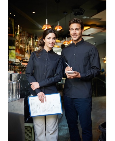 65% Polyester / 35% Popeline-Baumwolle. Pflegeleicht. Knopfloser Mao-Kragen. Ton-in-Ton Knöpfe. V-förmige Brusttasche links. Lange Ärmel mit abgerundeten und weitenverstellbaren Manschetten. 1 Ersatzknopf. Rund geschnittener Saum.