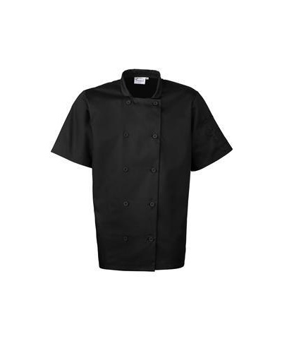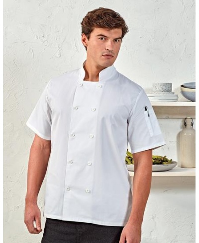 Eine Kochjacke mit kurzen Ärmeln und Wickelverschluss mit zehn Knöpfen. Um den Anforderungen wiederholten Waschens standzuhalten, bestehen die Knöpfe aus langlebigem Harz. Der linke Ärmel verfügt über eine praktische Stifttasche.