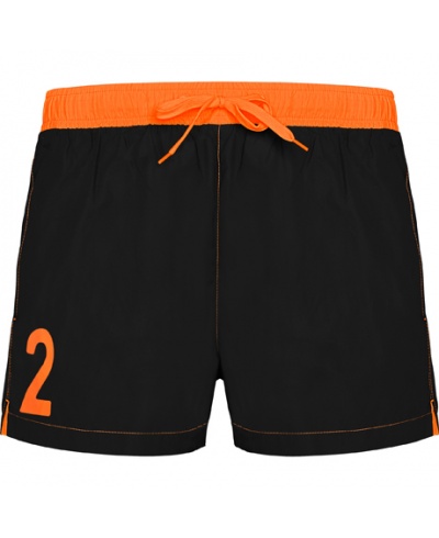 Kurze Badeshorts. Kontrastfarben bei Bund und Kordelzug, Seitennähten, Lasche der aufgesetzten, asymetrischen Gesäßtasche und den zwei Ablaufösen. Gesäßtasche mit Klettverschluss. Gedruckte Zahl, abhängig von der Farbauswahl. Netzfutter bei Innenhose und Seitentaschen.