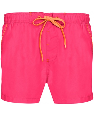 Kurze Badeshorts mit angedeutetem Hosenschlitz. Elastischer Bund mit modischem Verschluss. Kontrastfarben bei Kordelzug, den zwei Seitentascheneingriffen, der Lasche der aufgesetzten Gesäßtasche und Ablauföse. Seitenschlitze. Netzfutter bei Innenhose und Seitentaschen.