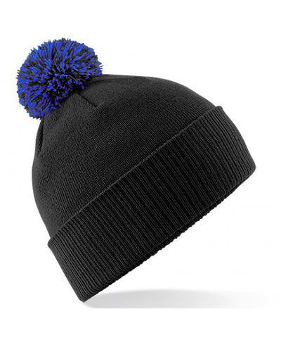 Tear-away Label für einfaches Neulabeln, Doppellagiger Strick, Zweifarbiger Pompon, Doppelfunktion - mit Umschlag als Mütze oder ohne Umschlag als Slouch-Beanie, Gerippter Umschlag